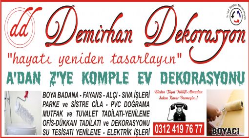 Ev Yenileme - Daire Tadilatı bizi arayın detaylı bilgi ve fiyat verelim . Ankara geneli her semtine ve ilçelerine Dekorasyon Firmaları ve Daire Tadilatı hususlarında ankarada dekorasyon firmaları içerisinde aynı gün mutlaka ücretsiz keşif ve fiyat landırma hizmeti vermekteyiz.
